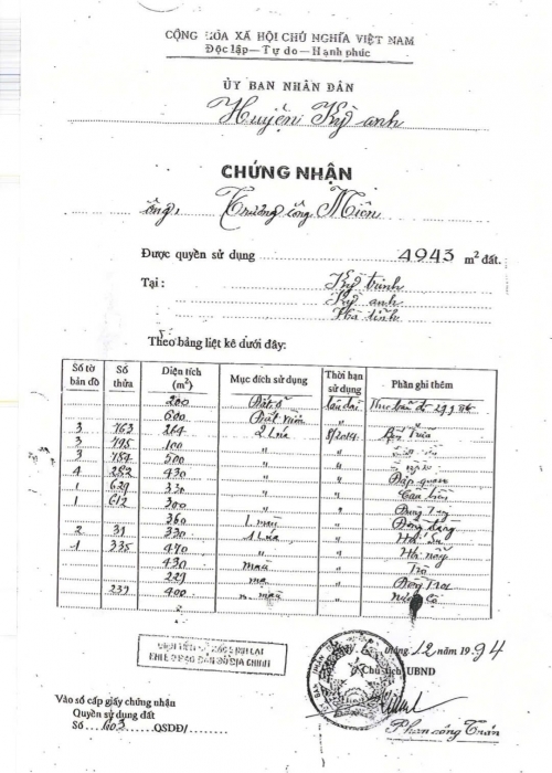 GCNQSDĐ huyện Kỳ Anh cấp cho hộ dân năm 1994. Ảnh: Thanh Nga. |