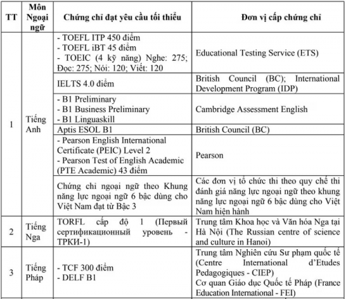 Danh sách các chứng chỉ được miễn thi môn Ngoại ngữ như sau: