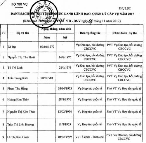 Danh sách 9 thí sinh thi tuyển vào 2 chức danh Vụ phó của Bộ Nội vụ. |