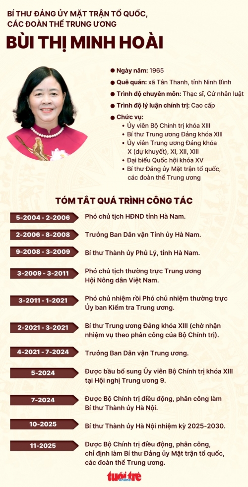 Theo quyết định của Bộ Chính trị, bà Bùi Thị Minh Hoài - Ủy viên Bộ Chính trị, Bí thư Thành ủy Hà Nội, Trưởng Đoàn đại biểu Quốc hội khóa XV - thôi tham gia Ban Chấp hành, Ban Thường vụ Thành ủy Hà Nội, thôi giữ chức Bí thư Thành ủy Hà Nội nhiệm kỳ 2025-2030.