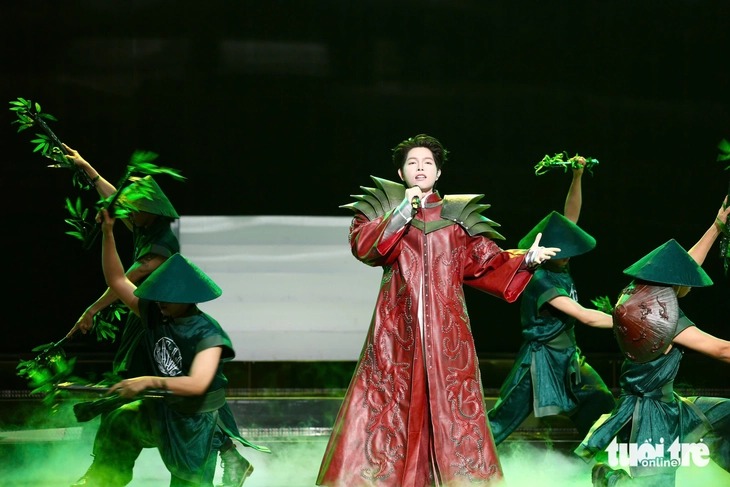 Ca sĩ Đức Phúc trình bày tiết mục "Đất nước lời ru - Phù Đổng Thiên Vương" trong đêm trao giải - Ảnh: NGUYỄN KHÁNH |