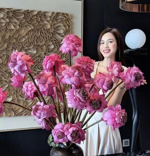 Căn hộ của Hoa hậu Đỗ Thị Hà có gam màu trung tính, nội thất được chọn lọc kỹ lưỡng từ vật liệu cao cấp, với điểm nhấn là những bình hoa tươi.