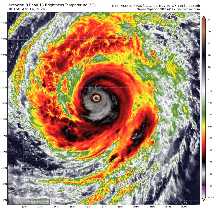 Sáng 14-4, siêu bão Sinlaku ở khu vực tây bắc Thái Bình Dương vẫn duy trì gió mạnh khoảng 210km/h (tương đương cấp 17) và đang hướng về quần đảo Bắc Mariana.