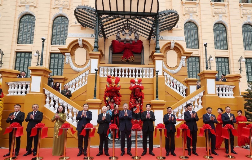 Tổng Bí thư Tô Lâm và Chủ tịch nước Lương Cường cùng các đồng chí lãnh đạo, nguyên lãnh đạo Đảng, Nhà nước đã thực hiện nghi thức cắt băng khánh thành công trình Trụ sở làm việc Cơ quan Chủ tịch nước.