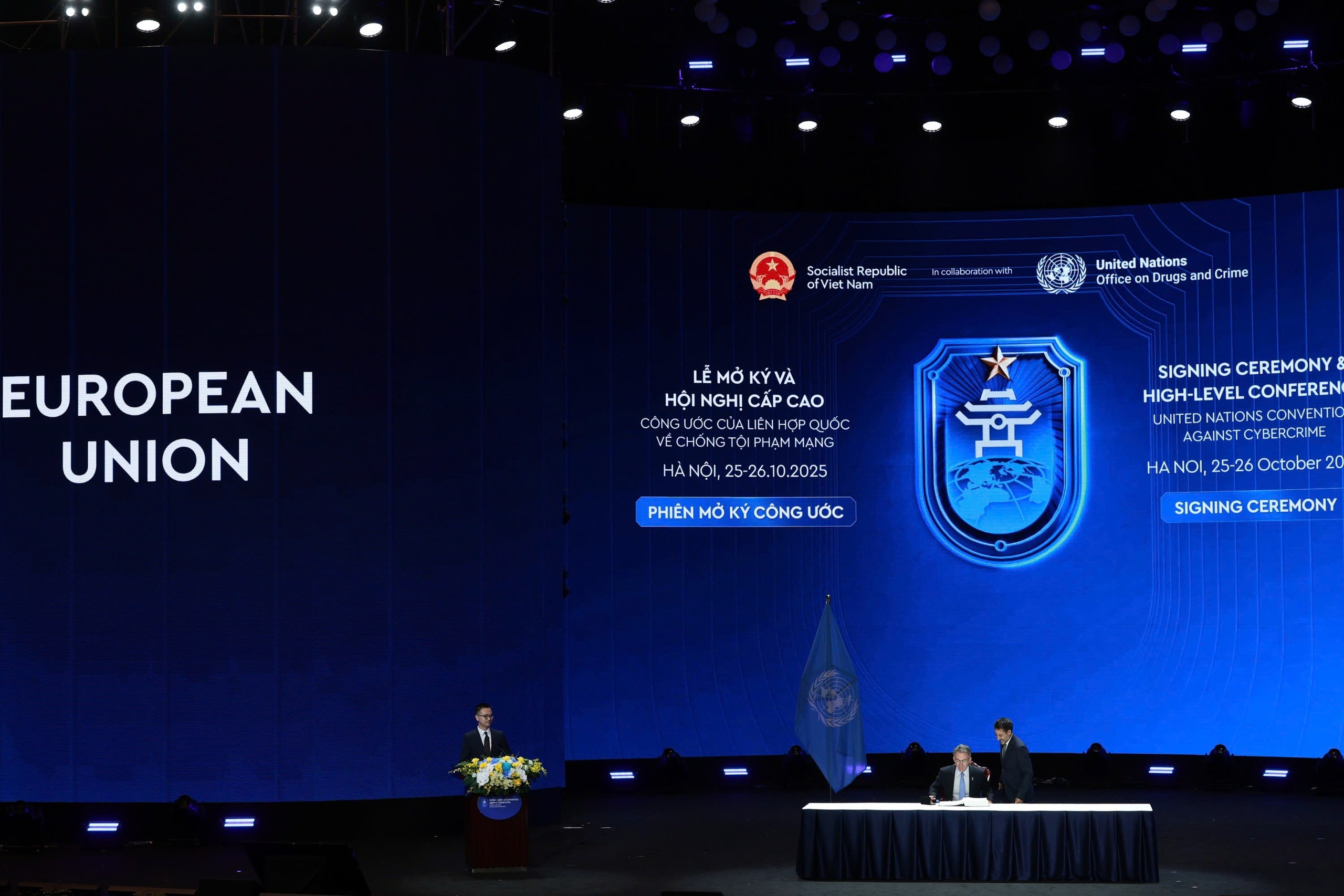 Đại diện Liên minh Châu Âu ký Công ước của Liên hợp quốc về Chống tội phạm mạng. Ảnh: Hữu Hưng |