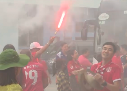 CĐV Hải Phòng đốt pháo sáng trước sân Hà Tĩnh chiều 18/4/2026. Ảnh: Chụp màn hình |
