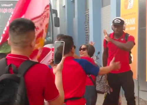 Tiền đạo Hải Phòng Joaquim Lupeta (phải) chào CĐV khi đến sân Hà Tĩnh. |