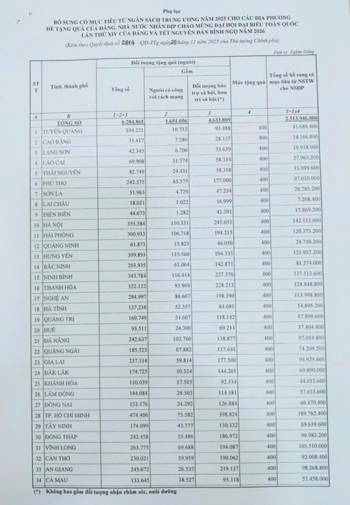Theo đó, bổ sung có mục tiêu từ ngân sách trung ương cho các địa phương số tiền gần 2.514 tỉ đồng từ nguồn dự phòng ngân sách trung ương năm 2025 để thực hiện tặng quà của Đảng, Nhà nước nhân dịp chào mừng Đại hội đại biểu toàn quốc lần thứ XIV của Đảng và Tết Nguyên đán Bính Ngọ năm 2026.