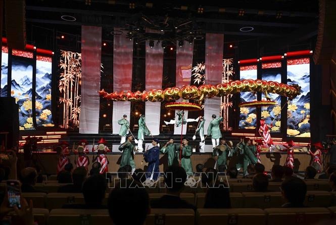 Trình diễn múa tương tác Mapping dải lụa - Hành trình vươn tầm. Ảnh: Hoàng Hiếu/TTXVN |