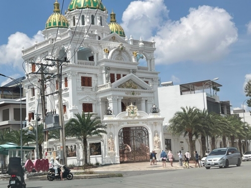 Theo chia sẻ của Ngân Collagen trên Facebook, dinh thđược xây dựng trên diện tích 1.000 m2, mất 5 năm mới có thể hoàn thiện. Dinh thự có màu trắng, chạm trổ hoa văn cầu kỳ theo lối kiến trúc cđiển. Toàn bộ ngôi nhà được lắp hệ thống đèn rực rỡ. Vào ban đêm, cả tòa nhà phát sáng nổi bật.