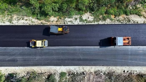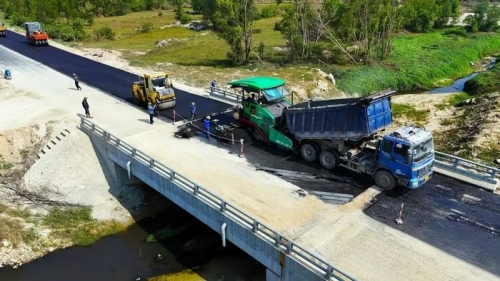 Máy móc thi công thảm nhựa tại Dự án đường trục ngang ven biển Thạch Hà. (Ảnh: Hữu Quyết/TTXVN) |
