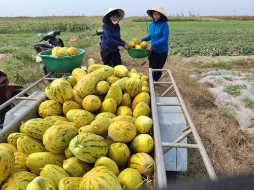 Ruộng dưa bở rộng 2.500 m2 của gia đình có sản lượng ước tính 10 tấn, đang vào độ chín. Theo bà Trương Tuyết, Chi hội trưởng Hội phụ nữ thôn Vân Thanh Bắc, đặc tính của dưa bở là khi chín vỏ sẽ nứt toác, ruột hỏng trong vài ngày nên phải hái đồng loạt khi quả ngả vàng. "Sợ bà con thiệt hại lớn, Hội Phụ nữ đã huy động hội viên ra đồng hỗ trợ", bà Tuyết nói.