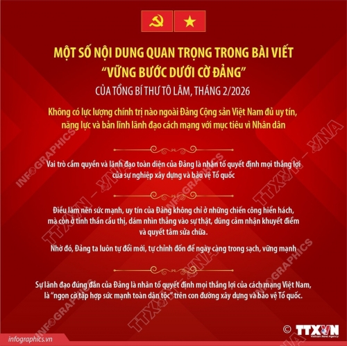 Trong bài viết “Vững bước dưới cờ Đảng” tháng 2/2026, Tổng Bí thư Tô Lâm khẳng định: Không có lực lượng chính trị nào ngoài Đảng Cộng sản Việt Nam đủ uy tín, năng lực và bản lĩnh lãnh đạo cách mạng với mục tiêu vì Nhân dân.