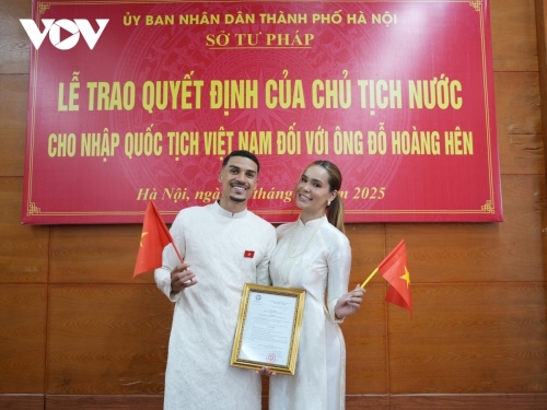 Đỗ Hoàng Hên chia sẻ niềm vui cùng bạn gái Lais Machado tại Lễ trao quyết định nhập quốc tịch Việt Nam.