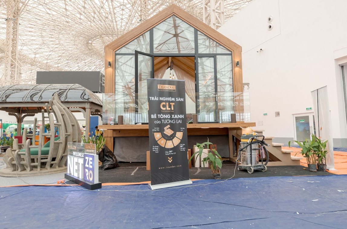 Một mô hình nhà mẫu ấn tượng, giới thiệu "Bê tông xanh CLT" và các giải pháp "Net Zero", thể hiện rõ xu hướng kiến trúc bền vững. |