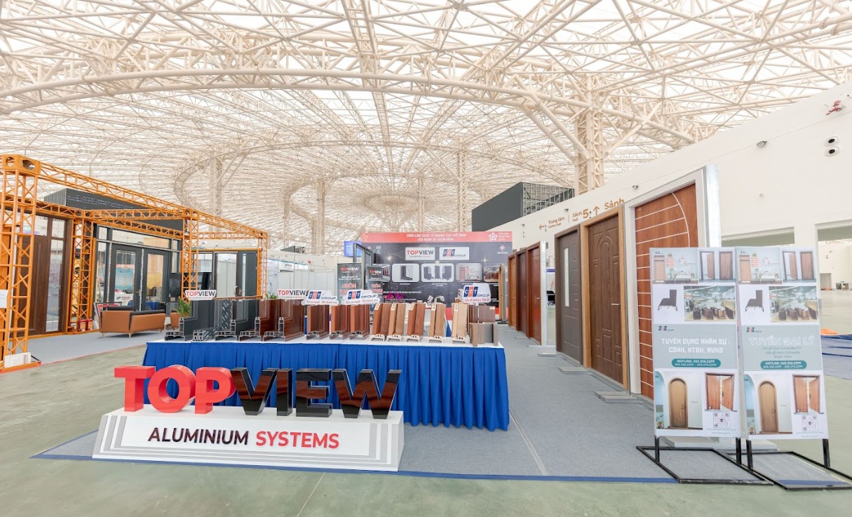 Gian hàng của TOP VIEW Aluminium Systems trưng bày hàng loạt mẫu cửa nhôm, vách kính và các giải pháp cửa ra vào hiện đại, sẵn sàng đón khách. |
