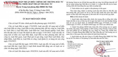 Mới đây, Phó Chủ tịch UBND tỉnh Hà Tĩnh Trần Báu Hà đã ký Quyết định số 72/QĐ-UBND, chấp thuận điều chỉnh chủ trương đầu tư đồng thời chấp thuận nhà đầu tư dự án Trang trại phong điện HBRE Hà Tĩnh (điều chỉnh lần thứ ba, ngày 31/12/2025).