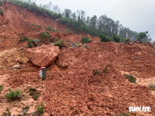 Hàng ngàn mét khối đất đá sạt lở xuống tuyến đường ven biển Hà Tĩnh - Ảnh: LÊ MINH |