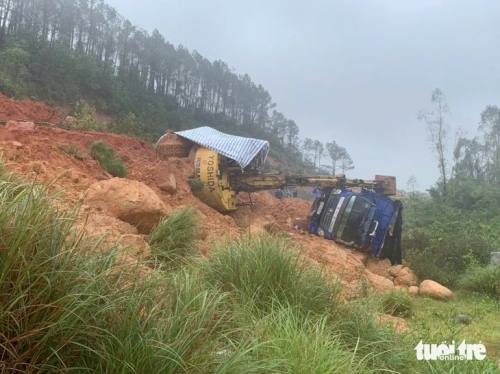 Sạt lở liên tục khiến phương tiện khi đến dọn dẹp đất đá bị xô nghiêng tại hiện trường - Ảnh: LÊ MINH |