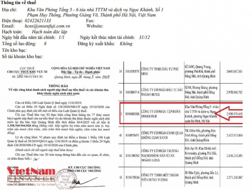 Onsen Fuji đặt trụ sở tại Hà Nội, vốn điều lệ 1.277 tỷ đồng, chỉ đăng ký 8 lao động và từng xuất hiện trong danh sách nợ thuế tại Quảng Bình vào năm 2025. |