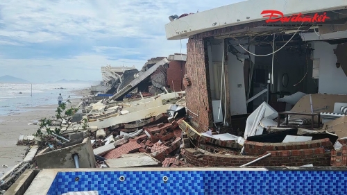 Còn phía trước các căn villa còn lại trên bờ biển không có dấu vết của hàng cọc dự ứng lực hay tấm kè kiên cố nào. Ở đây chỉ còn lại các bậc thềm, nền nhà bị gãy nát, hệ thống tường bao đổ sập, vỡ vụn.