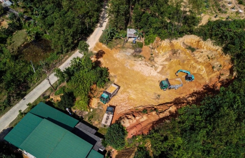 Đến đầu giờ chiều 3/12, khi phát hiện có phóng viên ghi hình, máy móc và phương tiện tại hiện trường lập tức dừng hoạt động. Chiếc máy xúc được di chuyển ra vị trí cách điểm múc khoảng 100m, các xe tải rời đi nhanh chóng. Hiện trường để lại là mặt đồi bị khoét thành nhiều cấp, các hố sâu rộng và đất đá tràn xuống khu vực xung quanh, cho thấy quá trình khai thác đã diễn ra liên tục nhiều giờ.