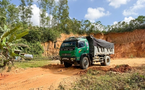 Xe tải mang BKS 38C-020.05 bắt đầu hành trình đưa đất ra khỏi chân đồi. Ảnh: Cẩm Kỳ |
