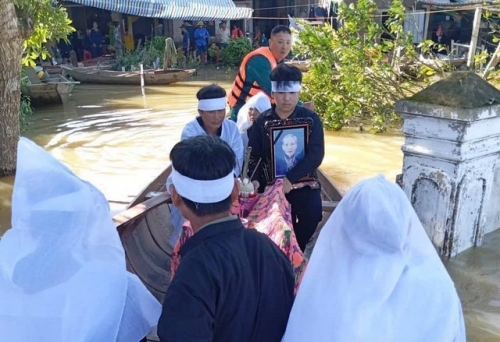 Do nước chưa rút nên hàng nghìn hộ dân ở Hà Tĩnh vẫn phải sống chung với lũ. Thậm chí, để tổ chức tang lễ cho người đã mất, người dân cũng phải chèo thuyền vượt lũ để kịp đi hoả táng.