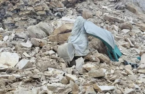 Tại hiện trường đất đá sụp lở ngổn ngang, vùi lấp hoàn toàn máy đào cỡ lớn PC800, chỉ còn lại cần và gầu xúc nằm trên đống đổ nát. |