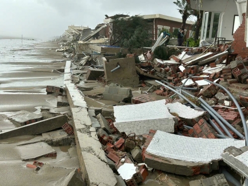 Hàng chục căn villa của Resort Hoa Tiên Xuân Thành (Khu du lịch biển Xuân Thành, xã Tiên Điền, tỉnh Hà Tĩnh) bị sóng, gió bão đánh phá tan tành. Ảnh: Hạnh Nguyên |
