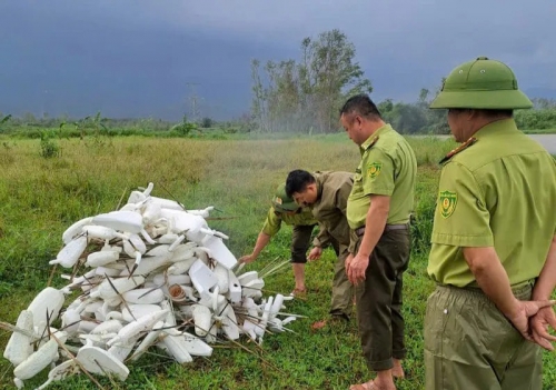 Các lực lượng chức năng ở tỉnh Hà Tĩnh tập trung tháo dỡ, tiêu hủy các công cụ, thiết bị người dân dùng để săn bắt trái phép chim di cư trong mùa mưa bão. |