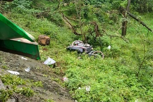 Tại hiện trường, ôtô đầu kéo hư hỏng nhẹ, suýt lao xuống taluy âm. Xe máy biến dạng, mảnh vỡ văng tung tóe, dầu tràn ra mặt đường.