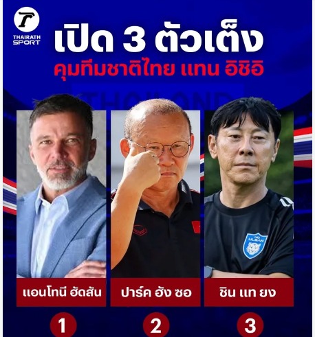 Theo Thairath Sport, 3 ứng viên dẫn dắt Thái Lan trong giai đoạn tới đó là HLV Park Hang Seo, HLV Shin Tae Yong và Anthony Hudson.