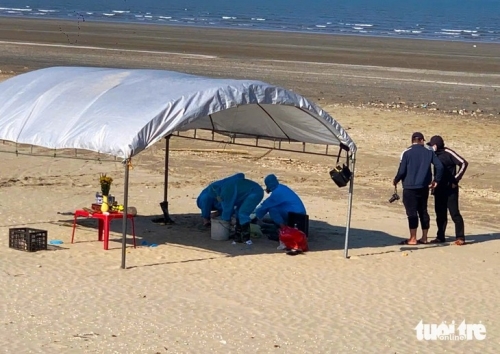 Lực lượng công an đang khám nghiệm tử thi trôi dạt trên vùng biển xã Lộc Hà - Ảnh: LÊ MINH