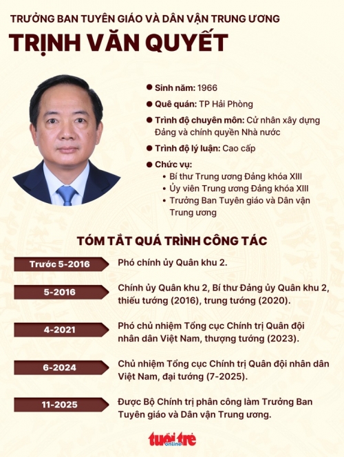 Theo quyết định của Bộ Chính trị, Đại tướng Trịnh Văn Quyết, Bí thư Trung ương Đảng, thôi tham gia Quân ủy Trung ương, Ban Thường vụ Quân ủy Trung ương nhiệm kỳ 2025 - 2030. Đồng thời được điều động, phân công, bổ nhiệm giữ chức Trưởng Ban Tuyên giáo và Dân vận Trung ương.
