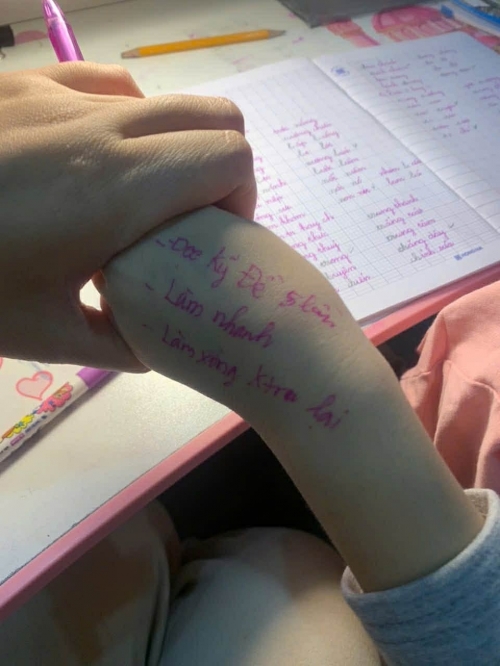 Chị Hương viết lên tay để dặn dò con khi thi học kỳ. Ảnh: NVCC. |