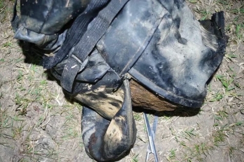 Trên lưng tử thi có đeo ba lô chứa tảng đá nặng khoảng 20 kg. Ảnh: Công an cung cấp. |