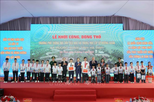 Phó Thủ tướng Thường trực Chính phủ Nguyễn Hòa Bình và các đại biểu thực hiện nghi thức khởi công Trường Phổ thông nội trú liên cấp Tiểu học và Trung học cơ sở Hương Xuân, tỉnh Hà Tĩnh. |