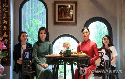 Cuộc trò chuyện giữa hai vị phu nhân Hàn Quốc và Việt Nam - Ảnh: YONHAP |