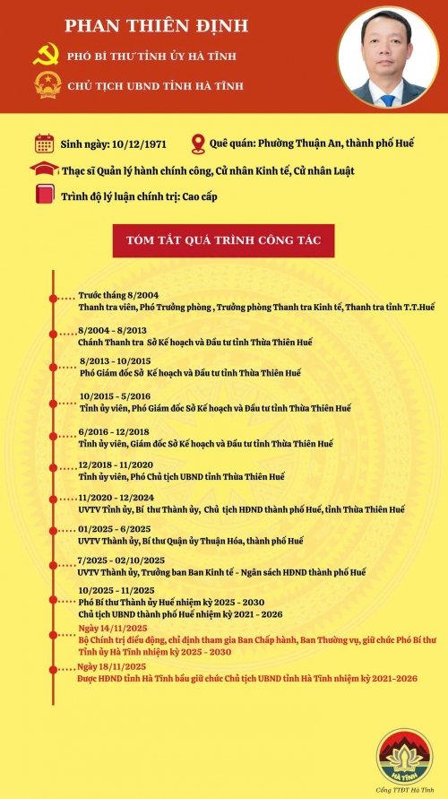 Tại Kỳ họp thứ 33 HĐND tỉnh Hà Tĩnh khóa XVIII nhiệm kỳ 2021-2026 diễn ra sáng 18/11, đồng chí Phan Thiên Định - Phó Bí thư Tỉnh ủy được bầu giữ chức Chủ tịch UBND tỉnh Hà Tĩnh nhiệm kỳ 2021-2026.