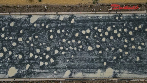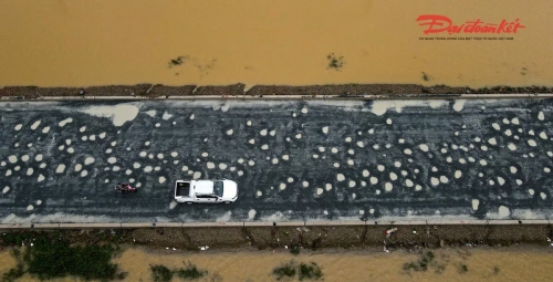 Trao đổi với Báo Đại đoàn kết, ông Hà Đức Nhanh, Phó giám đốc Công ty CP Xây dựng và Thương mại Ngọc Minh cho biết, từ đầu tháng 8/2025, đơn vị đã huy động nhân lực, máy móc, vật liệu, dựng lán trại để triển khai công việc. nhiều vị trí nền cũ bằng bê tông xi măng đã được đục bỏ và dặm vá bằng lớp base, những điểm hư hỏng nặng đang được khắc phục trước khi thảm hai lớp bê tông nhựa hoàn thiện. Dự kiến sau khi hoàn thành, mặt đường sẽ cao hơn nền cũ từ 40 – 60 cm, góp phần tránh ngập úng cục bộ khi mưa lớn. Ảnh: Cẩm Kỳ |