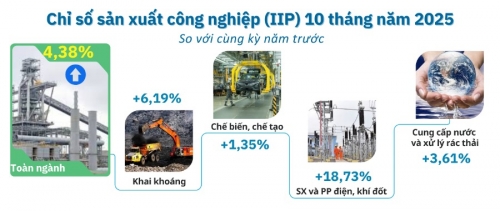 Tính chung 10 tháng năm 2025, chỉ số sản xuất ngành công nghiệp Hà Tĩnh tăng 4,38% so với cùng kỳ năm 2024. Trong đó, ngành khai khoáng tăng 6,19%, đóng góp 0,1 điểm phần trăm vào mức tăng chung; ngành chế biến, chế tạo tăng 1,35%, đóng góp 1,11 điểm; ngành sản xuất và phân phối điện tăng 18,73%, đóng góp 3,07 điểm; ngành cung cấp nước và xử lý rác thải tăng 3,61%, đóng góp 0,1 điểm.
