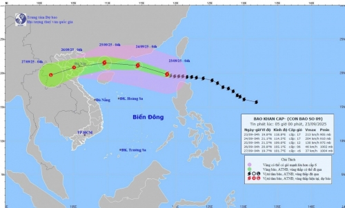 Hồi 4h sáng nay (23/9), tâm siêu bão số 9 ở vị trí 19,8 độ vĩ Bắc; 118,8 độ kinh Đông, trên vùng biển phía Đông Bắc Biển Đông. Sức gió mạnh nhất vùng gần tâm bão đạt cấp 17 (202-221 km/giờ), giật trên cấp 17, di chuyển theo hướng Tây Tây Bắc với tốc độ khoảng 20 km/giờ.