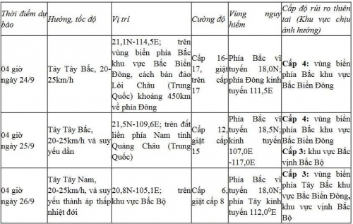 Từ đêm 24-26/9, Bắc Bộ, Thanh Hóa và Nghệ An có mưa rất to, lượng phổ biến 100-250 mm, có nơi trên 400 mm. Nguy cơ cao xảy ra ngập úng tại vùng trũng, lũ quét ở sông suối nhỏ và sạt lở đất trên sườn dốc.