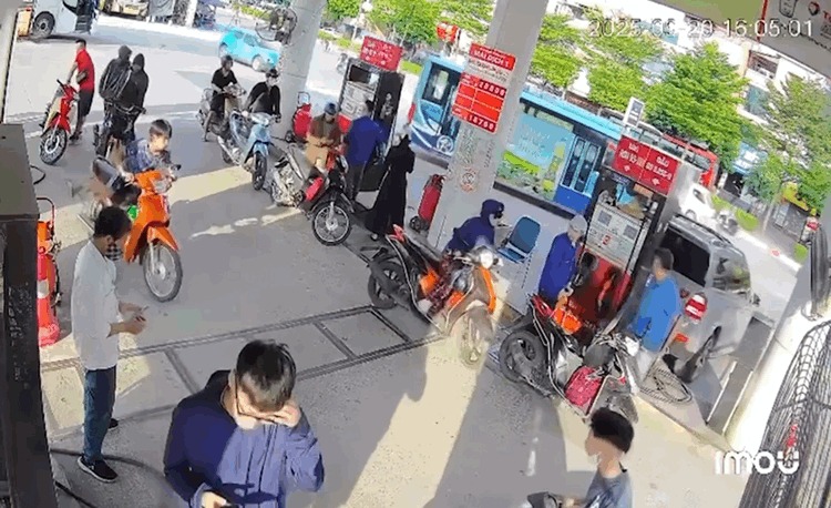 Chiếc xe ô tô hiệu Mercedes lùi làm đổ trụ bơm xăng đè trúng một nhân viên bán xăng cùng hai xe máy gây cháy.