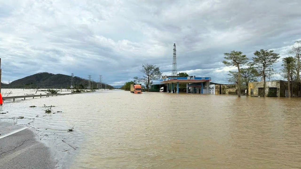 Sau trận mưa lớn do ảnh hưởng của hoàn lưu bão số 5, một đoạn Quốc lộ 1A ở Hà Tĩnh bị ngập sâu trong nước, khiến các phương tiện giao thông không thể đi qua.