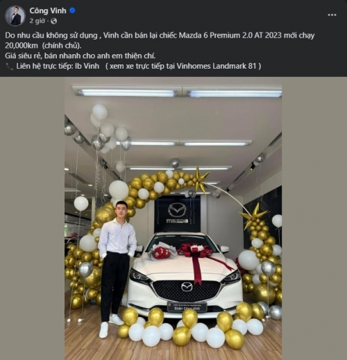 Việc Đoàn Công Vinh đăng bán chiếc xe Mazda 6 Premium 2.0 AT đời 2023 đang thu hút sự chú ý của cư dân mạng.