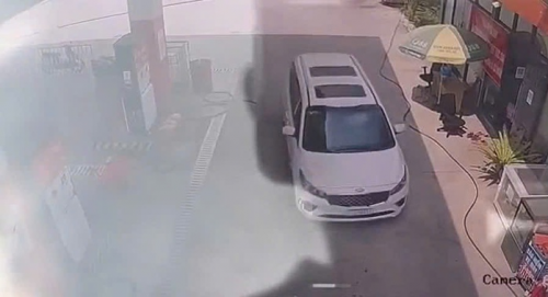 Sau khi đổ xăng xong, tài xế chiếc SUV hồn nhiên lái xe bỏ đi mà không rút vòi bơm khiến cả trụ xăng bị kéo đổ. Cây xăng sau khi đổ xuống đất đã phát nổ khiến cả trạm xăng bốc cháy dữ dội.
