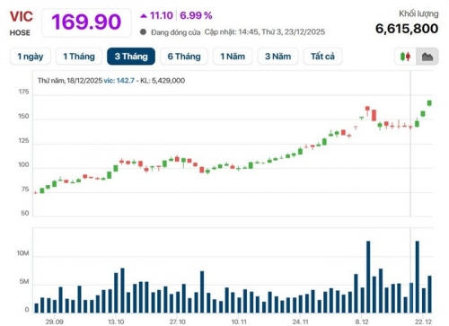 Trong phiên giao dịch ngày 23/12, cổ phiếu VIC của Tập đoàn Vingroup tiếp tục tăng kịch trần, chốt phiên tại 169.900 đồng/cổ phiếu, đánh dấu phiên tăng trần thứ hai liên tiếp. Đà tăng mạnh đã đưa VIC vượt đỉnh lịch sử, kéo vốn hóa thị trường của Vingroup lên mức xấp xỉ 1,3 triệu tỷ đồng, con số cao nhất từ trước đến nay trong lịch sử thị trường chứng khoán Việt Nam.