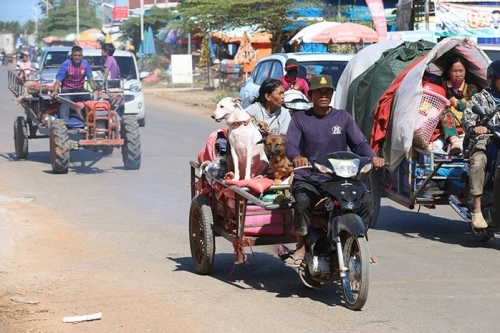 Xe cộ rời khỏi huyện Srei Snam, tỉnh Siem Reap, sau khi tiêm kích Thái Lan thả bom gần trại tị nạn. Ảnh: Khmer Times |